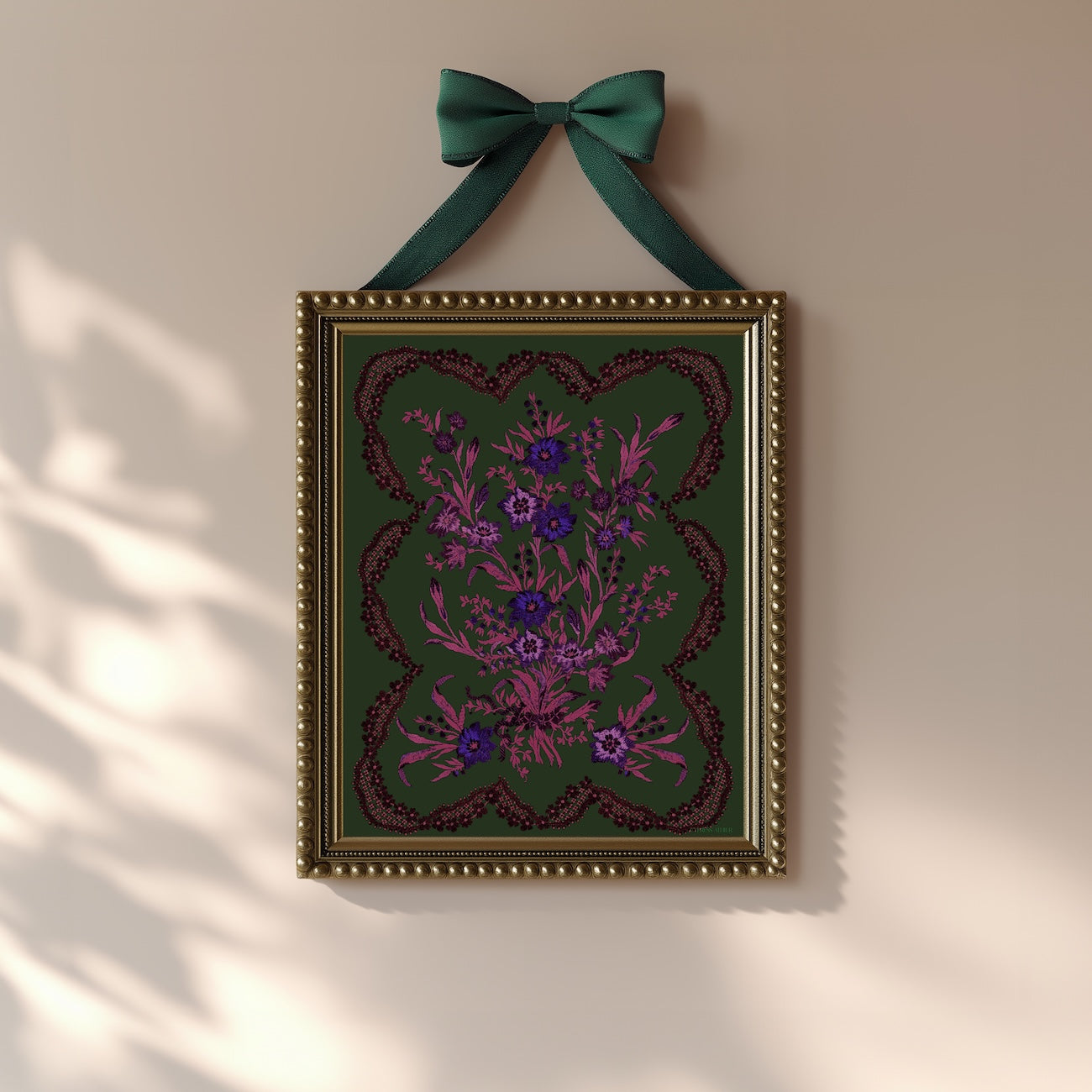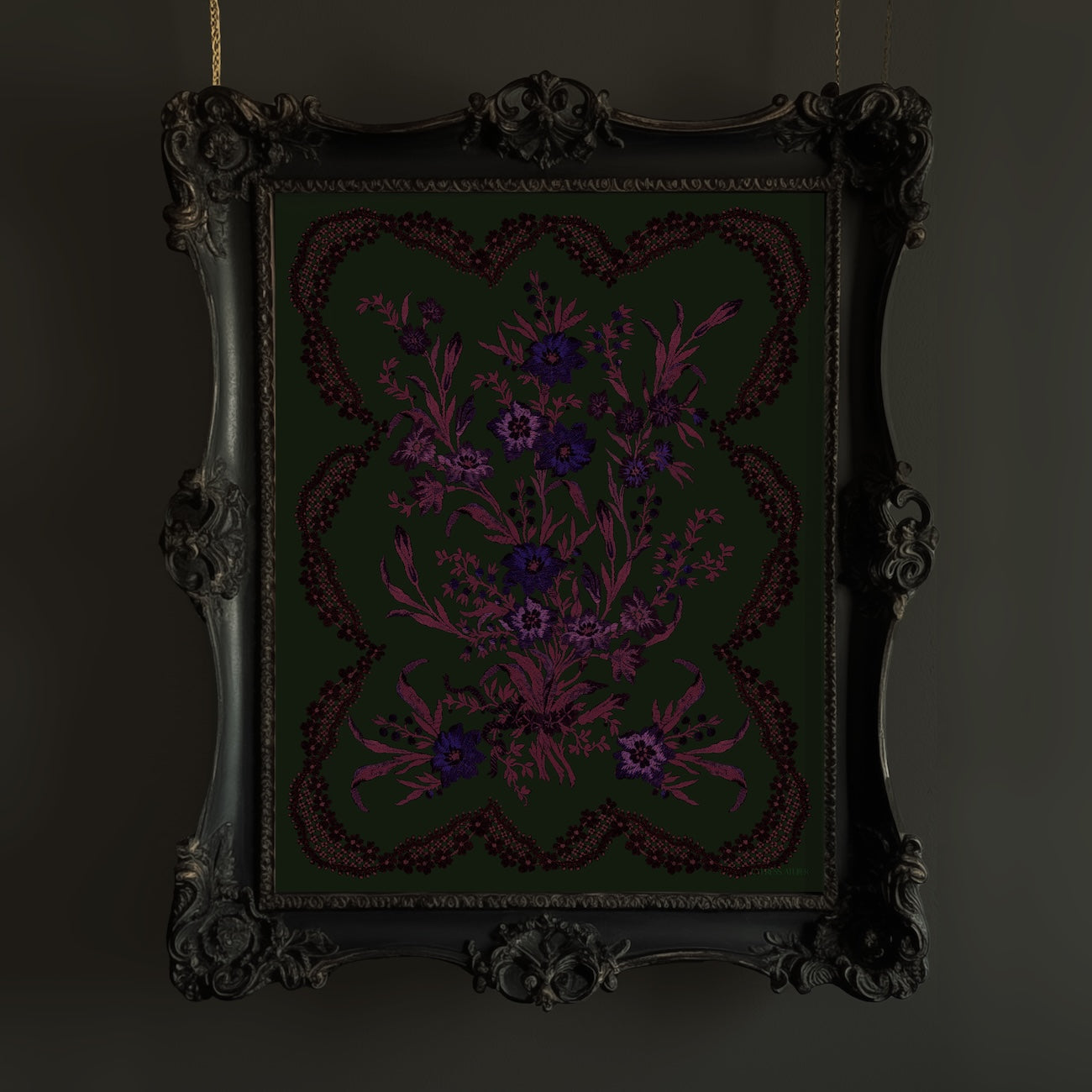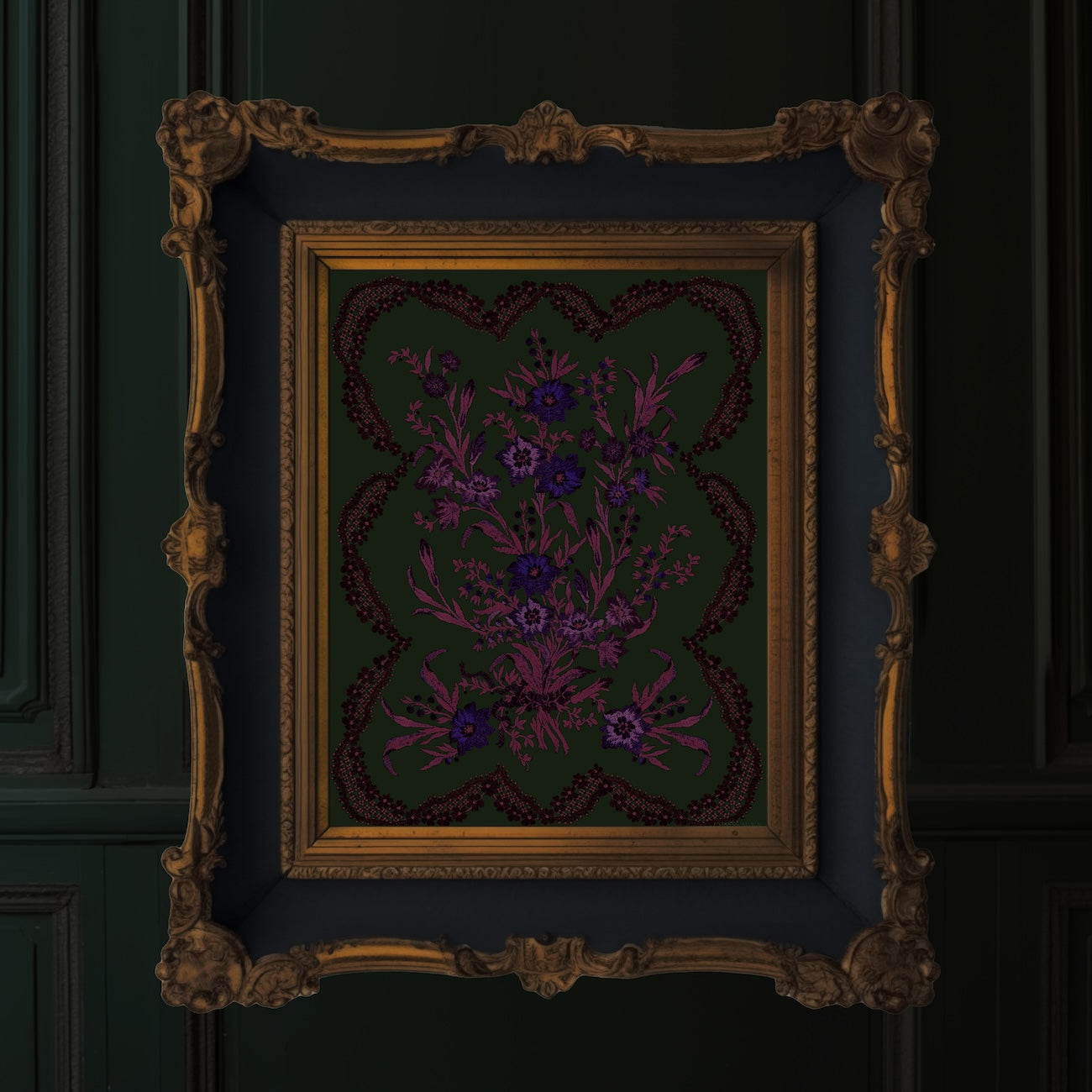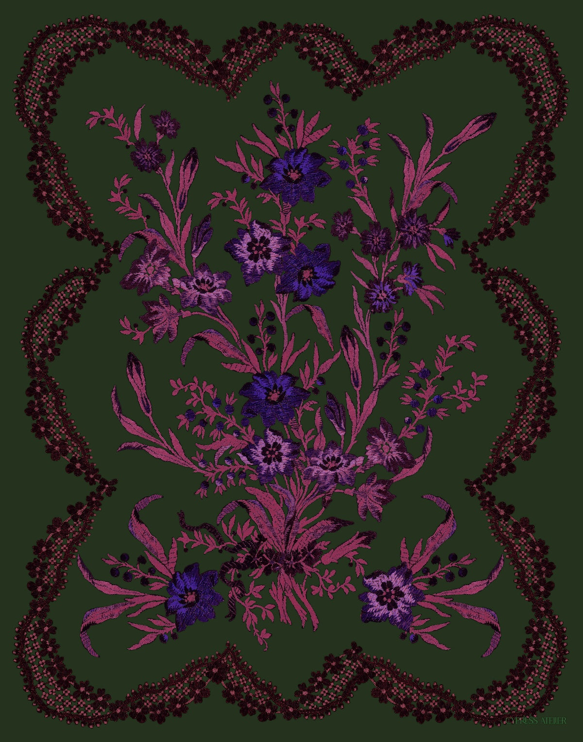 Derived from a classic silk jacquard tapestry, surreal pink stalks of foliage and lilac flowers are framed by a border of black lace trim for this alluring Neo-Victorian inspired piece. The Green Victorian Posy is maximalist, eclectic, and never boring.
