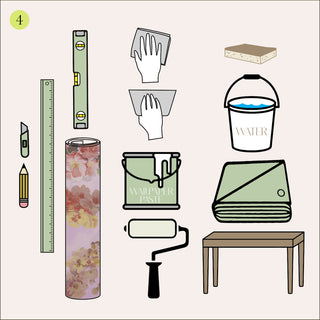 - Gather your tools and make sure all are clean: level, straight edge, pencil, wallpaper paste, brush or napped roller, wallpaper smoothing tool, drop cloth or tarp, utility knife, a bucket of clean water, sponge, dry cloth, a clean table/workspace, and of course your wallpaper rolls.