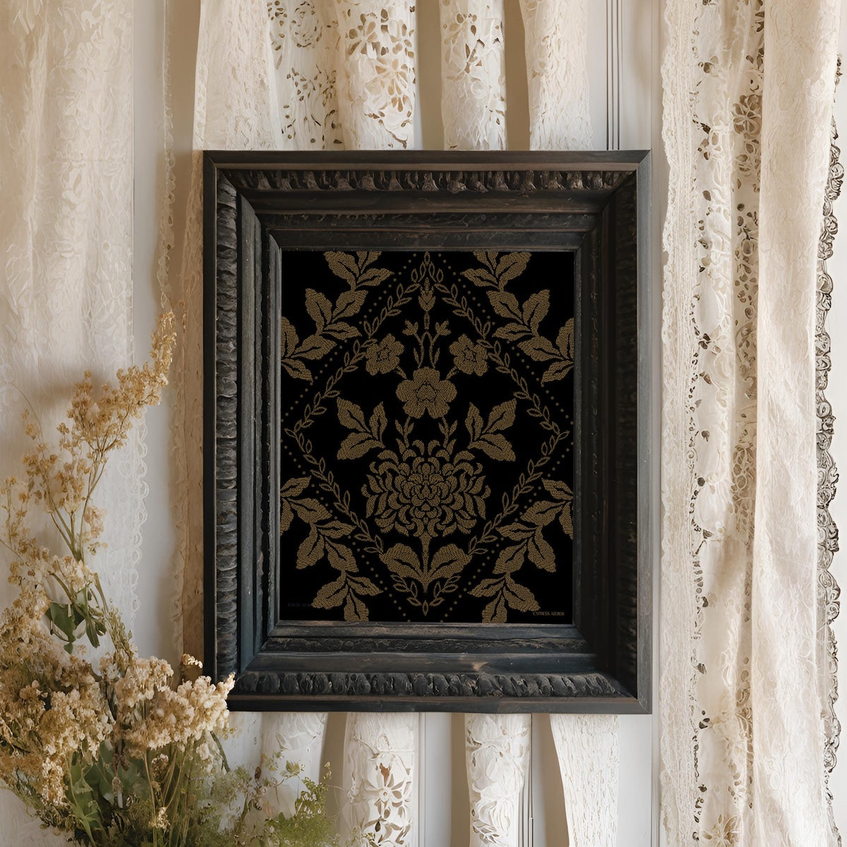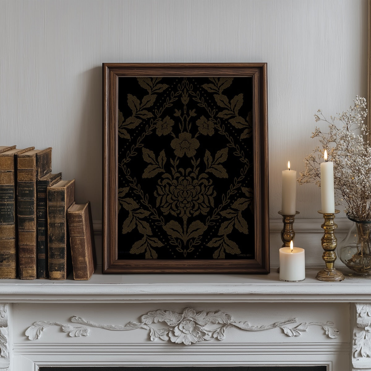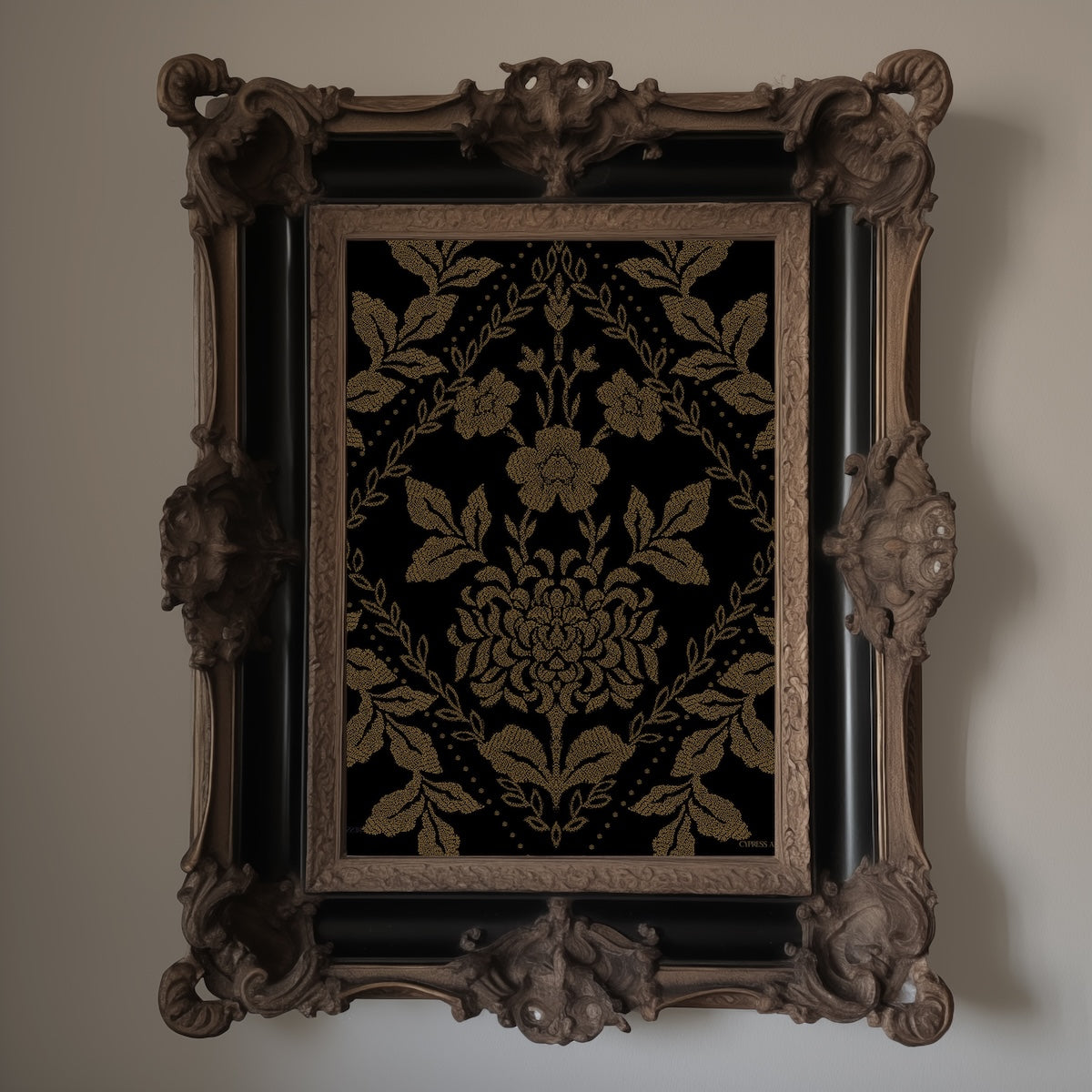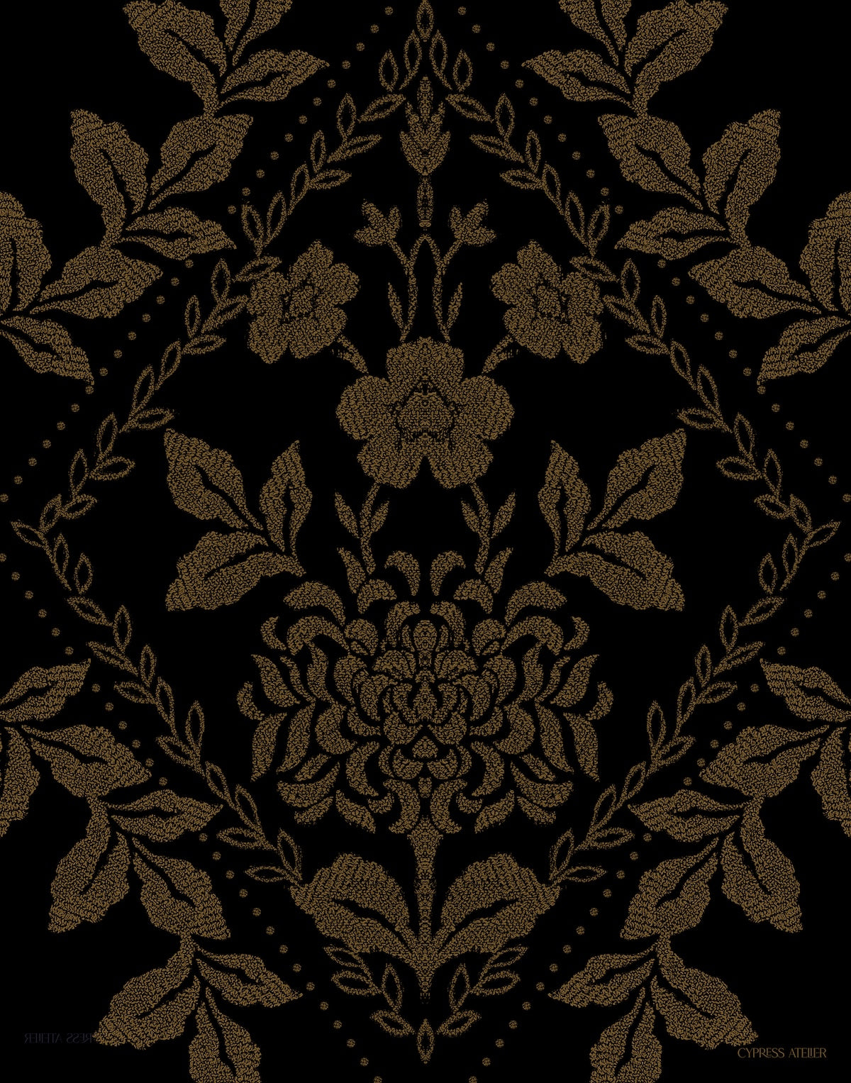 In a style of folk art tapestry, the dahlia rises upwards in three peaks, symbolizing growth, perseverance, and transcendence. Dahlias are associated with dignity, strength, and resilience due to their ability to continue growing after many other flowers perish, the brass hued pattern a symbol of subtle strength quietly emerging from the depths of dark raven winds- mysterious, regal, and absolute.